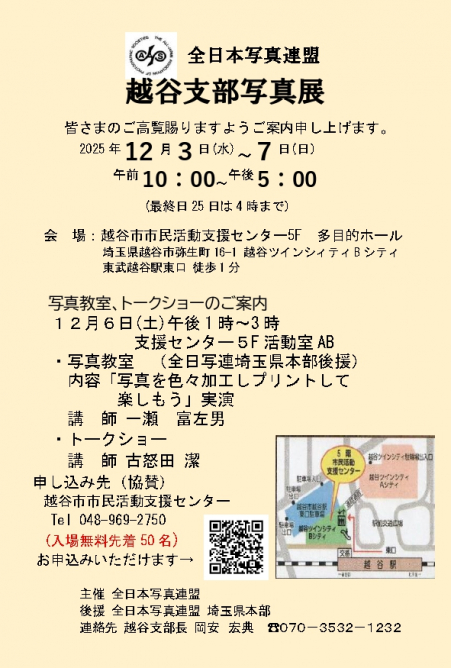 越谷市市民活動支援センター 写真教室、トークショー 開催日|2025/12/06 動画・SNS・カメラ 内容「写真を色々加工しプリントして楽しもう」 実演:講師 一瀬 富左男 トークショー:講師 古怒田 潔 予約受付中 現地払い 記事を読む